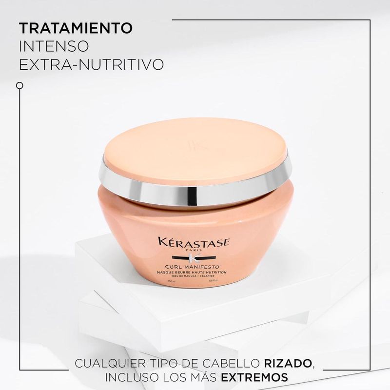 Mascarilla extra-nutritiva con miel de Manuka y Ceramida para cabello rizado y afro. Su fórmula enriquecida nutre intensamente y refuerza los rizos frágiles y dañados, previniendolos constantemente co