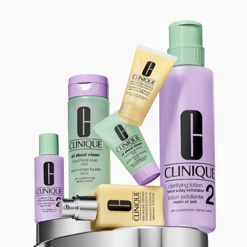 El sistema de cuidado de la piel 3 pasos de Clinique para una piel de aspecto saludable: un set para casa, uno para viajes. Personalizado para tipos de piel más secos.